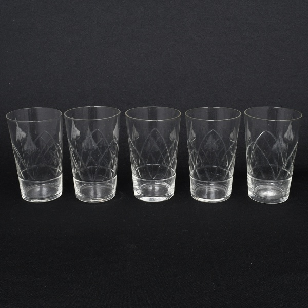 • Conjunto de copos em meio cristal, diáfano e incolor, bojo cilíndrico decorado com lapidação geométrica em padrão losangular e folhagens estilizadas, distribuídas na porção média. Composto de cinco(05) unidades. Medidas: