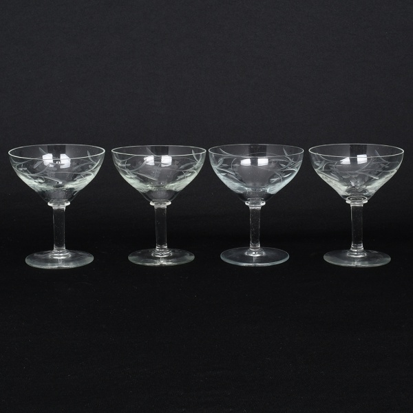 • Conjunto de taças para champanhe em cristal, diáfano e incolor; bojo hemisférico talhado com padrão flores estilizadas, fuste tubular sobre base circular. Composto de quatro(04) unidades. Medidas: