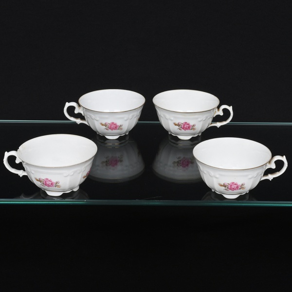 • Porcelana Real, Mauá - SP(Fundada em 1943 por Fritz Erwin Schmidt). Quatro(04) xícaras para chá(sem pires) em porcelana nacional, esmaltação branca modelada com frisos e volutas em relevo; bojo decorado com composição floral em estampagem policromada, predominando as tonalidades rosa e ocre, bordas contornada por friso em douradura, alça lateral em voluta. Marca da manufatura ao fundo. Medidas: Alt.: x Diam.: