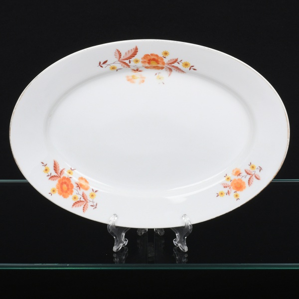 • Jean Haviland, Limoges - França. Belíssima travessa oval executada em porcelana francesa da década de 1950/60; centro ligeiramente rebaixado, esmaltagem vítrea na cor branca, decoração em estampagem policromada, composta por ramagens florais estilizadas distribuídas assimetricamente na aba, borda contornada por friso em douradura. Marca da manufatura no verso. Medidas: Comp.: 29,5 x Larg.: 21 cm. Apresenta leves desgastes na policromia e na douradura.