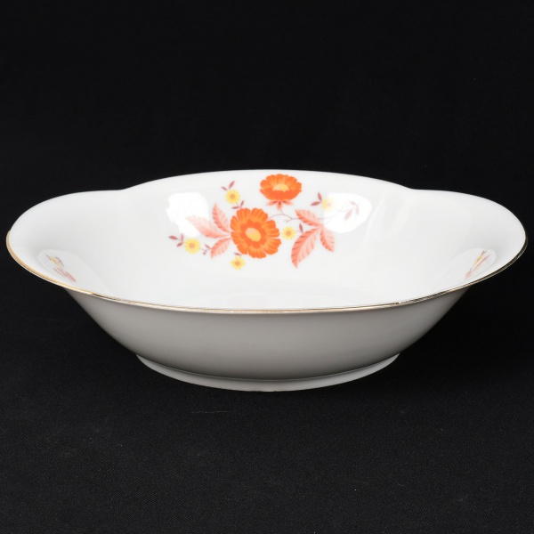 • Jean Haviland, Limoges - França. Belíssima travessa funda executada em porcelana francesa da década de 1950/60; formato oblongo, esmaltagem vítrea na cor branca, decoração em estampagem policromada, composta por ramagens florais estilizadas distribuídas assimetricamente na orla interna, borda quadrilobada contornada por friso em douradura. Marca da manufatura no verso. Medidas: Alt. 5,5 x Comp.: 24 x Larg.: 19 cm. Apresenta minúsculo bicado no verso da borda.