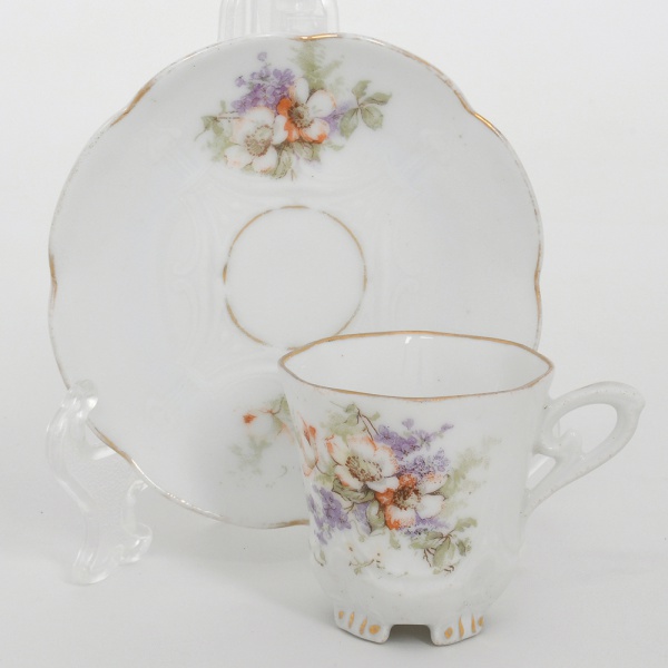 • Chávena de coleção, para café, em porcelana europeia do início do século XX, período e estilo Art Nouveau; esmaltação na cor branca, modelada com elementos do gênero sob o vidrado, decorada com composição botânica em policromia, predominando as tonalidades violeta, verde e marsala, realçado com singelos arremates em douradura(apresenta desgaste); bojo obcônico facetado com oito lados, base com pequenos apoios moldados e asa lateral estilizada, padrão decorativo replicado no pires. Marcado com numeração ao fundo. Medidas: Alt.: 5,5 x Comp.: 7,5 x Larg.: 5,5 cm; Pires: Diam.: 11 cm.