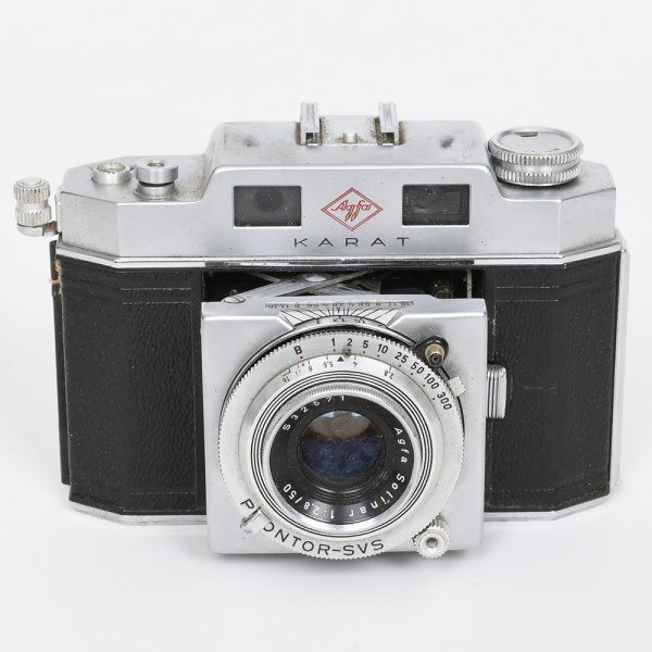 • Câmera fotográfica de médio formato Agfa Karat. Corpo em metal com revestimento em material sintético preto texturizado, de construção retangular com arestas facetadas. Parte superior em metal com inscrição Agfa Karat e duas janelas do visor frontal. Equipada com objetiva Agfa Solinar 1:2.8 f=50 mm, montada em conjunto Prontor-SVS, com anéis graduados para controle de velocidade do obturador e abertura do diafragma. Sistema de foco frontal com escala graduada, montado em suporte retrátil característico das câmeras da série. Interior com compartimento para filme em cartucho, apresentando numeração RN 1564. Base com inscrição Made in Germany. Acompanha estojo original em couro marrom, com costuras aparentes e gravação Karat 6015  Made in Germany. Estado conforme fotografias, não foi testada, sem garantias de funcionamento. Medidas: Alt.: 9,5 x Comp.: 13,5 x Larg.: 7,5 cm.