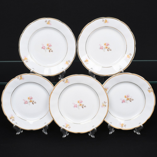 • Porcelana Rio Branco/Cia. Brasileira de Vidros, Rio de Janeiro - RJ(Fundada em 1947, ativa até 1967). Conjunto de pratos para sobremesa em porcelana nacional da década de 1950; esmaltagem vítrea na cor branca, dotada de decoração em estampagem policromada, com padrão de flores predominando as tonalidades rosa, amarelo, castanho e cinza, aba circundada com leve movimento ondulatório modelado na própria pasta, borda recortada contornada por friso em douradura. Marca da manufatura no verso. Composto de cinco(05) unidades. Medida: Diam.: 19 cm. Apresentam marcas de uso, vide foto.