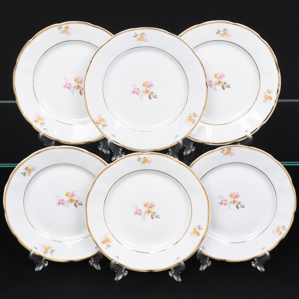 • Porcelana Rio Branco/Cia. Brasileira de Vidros, Rio de Janeiro - RJ(Fundada em 1947, ativa até 1967). Conjunto de pratos para sobremesa em porcelana nacional da década de 1950; esmaltagem vítrea na cor branca, dotada de decoração em estampagem policromada, com padrão de flores predominando as tonalidades rosa, amarelo, castanho e cinza, aba circundada com leve movimento ondulatório modelado na própria pasta, borda recortada contornada por friso em douradura. Marca da manufatura no verso. Composto de seis(06) unidades. Medida: Diam.: 19 cm. Apresentam marcas de uso, vide foto.