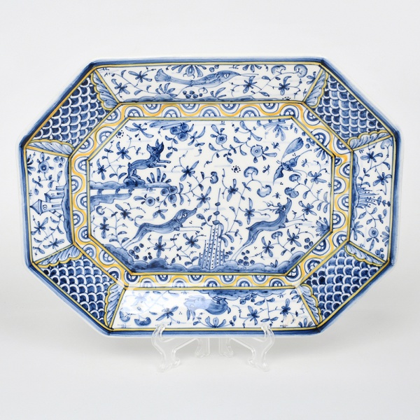 • Travessa em faiança, produção portuguesa da região de Coimbra, estilo barroco de influência seiscentista. Forma oitavada com bordo recortado e aba facetada. Decoração em azul sobre fundo branco, com aplicação de filetes em amarelo. Campo central com composição de animais estilizados, incluindo quadrúpedes em movimento, aves e elementos fitomorfos distribuídos em padrão contínuo. Presença de elemento arquitetônico estilizado ao centro. Aba segmentada com reservas decoradas, alternando painéis com motivos vegetalistas e padrões geométricos, incluindo escamas e volutas.  Verso contendo inscrição manuscrita em azul sob esmalte: Atelier B.L., Coimbra, Portugal, Séc. XVII, indicativa de reprodução historicista. Medidas: Comp.: 33 x Larg.: 25 cm.