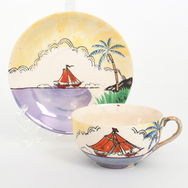 • Xícara para chá em faiança japonesa, bojo hemisférico com asa lateral em arco, com acabamento anacarado. Decoração manual em esmaltes sobre vidrado, com composição paisagística estilizada: embarcação à vela de pano vermelho sobre faixa dágua em tom violáceo, acompanhada por palmeira inclinada e  vegetação, sob céu em gradação amarelada com nuvens delineadas. Verso com marca de manufatura em esmalte vermelho e inscrição Marca Registrada  Made in Japan. Apresenta desgaste no filete metálico da asa, craquelê no vidrado e pequenas marcas de uso, visíveis nas fotografias. Medidas: Xícara: Alt.: 5 x Comp.: 10,5 x Larg.: 8,5 cm; Pires: Diam.: 13 cm.