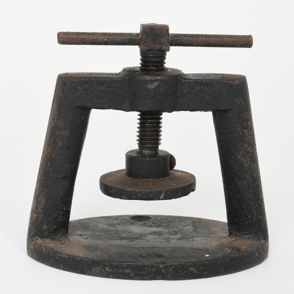 • Prensa manual construída em ferro fundido, composta por base oval plana com perfuração frontal para fixação, dois montantes verticais e travessa superior. No centro da travessa encontra-se parafuso roscado vertical, acionado por manivela transversal em ferro maciço. A extremidade inferior do parafuso apresenta platô circular móvel, destinado à compressão contra a base. Estrutura monobloco em ferro fundido, com elementos mecânicos em ferro forjado e aço roscado. Medidas: Alt.: 12 x Comp.: 12 x Larg.: 9 cm.