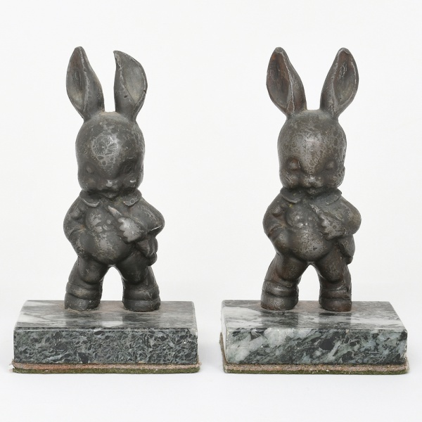 • Par de esculturas confeccionadas em chumbo representando coelhos antropomorfizados, modelados em posição ereta, com orelhas longas e eretas, mãos apoiadas sobre o ventre e vestimentas estilizadas sugerindo traje infantil ou figurino de fantasia; apresentam modelagem volumétrica simples e expressão suavemente caricatural, característica de objetos decorativos do início do século XX., cada escultura encontra-se fixada sobre base retangular em mármore verde com rajados, configurando conjunto destinado ao uso como aparadores de livros (bookends). Medidas: Alt.: 15 x Comp.: 6 x Larg.: 5 cm;  Base: Alt.: 2,5 x Comp.: 10 x Larg.: 8 cm.