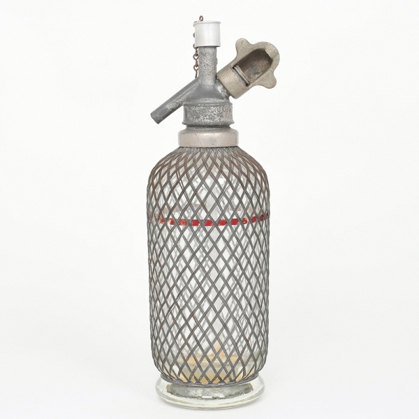 • Sifão para água gaseificada, composto por recipiente cilíndrico em vidro transparente, protegido por armação metálica em malha entrelaçada, assentado sobre base circular espessa, parte superior apresenta cabeçote metálico rosqueado, com válvula de acionamento manual, bico de saída lateral e suporte para cartucho de gás, possui tampa superior com corrente metálica, elemento utilizado para retenção do componente móvel do sistema. Estrutura composta por corpo em vidro espesso soprado, grade protetora em arame metálico e mecanismo superior em metal fundido e usinado. Tipologia de sifão de soda, utilizado para carbonatação e serviço de água gaseificada ou bebidas efervescentes. Não foi testado, sem garantias de funcionamento. Apresenta marcas do tempo e de uso, visíveis nas fotografias. Medidas: Alt.: 31 x Diam.: 9 cm.