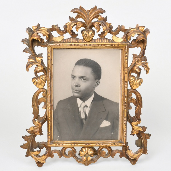• Porta-retrato em madeira ornamentada com douramento, com moldura vazada, ornamentada por motivos fitomorfos e volutas em relevo, com composição simétrica e elemento central superior em forma de palmeta. Reverso com suporte articulado em metal e placa posterior. Medidas: Alt.: x Comp.: