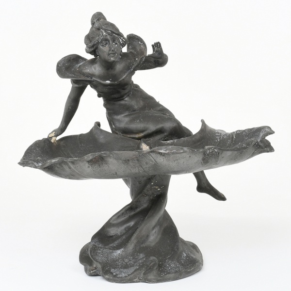• Escultura executada em metal fundido, representando figura feminina em composição alegórica, apoiada sobre elemento em forma de folhagem estilizada, integrado à base, vinculada ao estilo Art Nouveau, final do século XIX / início do século XX. Suporte usado como bandeja para correspondência, constituído por folha de grandes dimensões, com bordas recurvadas e nervuras sugeridas; base inferior com tratamento orgânico contínuo. Figura modelada em movimento, com corpo inclinado e membros projetados, trajando vestimenta com pregueado. Apresenta marcas e desgastes de uso e do tempo, demanda restauros. Medidas: Alt.: x Comp.: x Larg.: