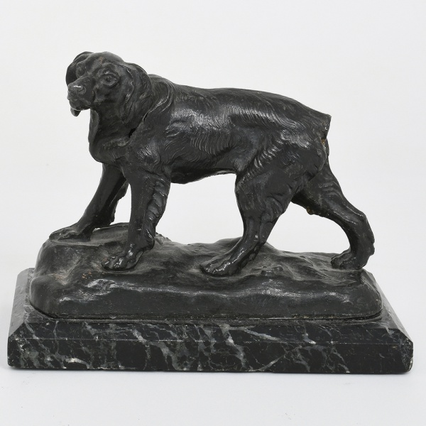• Escultura animalista executada em metal fundido, representando cão em posição de marcha, apoiado sobre base naturalista, fixada em plinto retangular em mármore. Figura modelada em volume pleno, com tratamento de superfície por cinzelamento e incisão para definição de pelagem, musculatura e feições; cabeça voltada lateralmente, orelhas pendentes, cauda curta; base superior com relevo irregular simulando terreno. Plinto em mármore de tonalidade escura com veios contrastantes, de formato retangular, com arestas retas. Medidas: