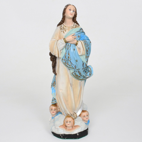 • ARTE SACRA. Nossa Senhora da Imaculada Conceição. Imagem sacra executada em estuque moldado e policromado, e olhos de vidro. Apresenta-se em posição ereta, com as mãos cruzadas sobre o peito em sinal de devoção e o olhar voltado levemente para o alto. Traja túnica longa em tonalidade clara e manto azul ornamentado com estrelas e elementos vegetalistas dourados, atributos iconográficos característicos da representação mariana da Imaculada Conceição; composição apoia-se sobre base formada por nuvens, onde se dispõem três cabeças de querubins alados, elemento recorrente na iconografia devocional católica associada à representação da Virgem Imaculada, modelagem evidencia o tratamento das pregas das vestes, bem como dos cabelos ondulados que descem sobre os ombros. Base inferior plana com revestimento em feltro. Apresenta desgastes acentuados, pequena quebradura numa das pontas do manto, visíveis nas fotografias.