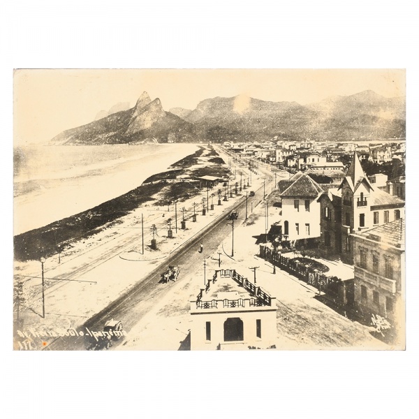 • Fotografia em preto e branco, impressão sobre papel aplicada sobre moldura de madeira, representando a orla de Ipanema e Leblon, no Rio de Janeiro, com vista panorâmica da faixa litorânea, avenida marginal e alinhamento de postes de iluminação ao longo da via. Em primeiro plano, edificações residenciais e estruturas urbanas, e ao fundo o Morro Dois Irmãos. Inscrição manuscrita no canto inferior indicando Vieira Souto, Ipanema  1929. Atribuída ao fotógrafo Augusto Malta. Medidas: Alt.: 29 x Comp.: 39 cm.