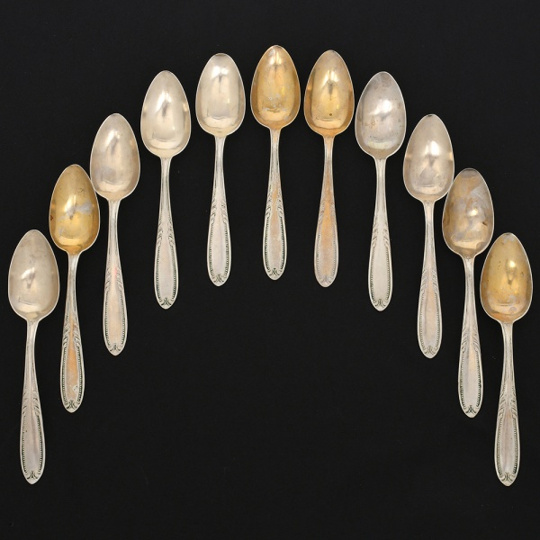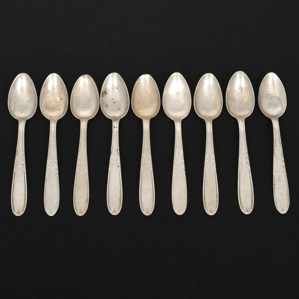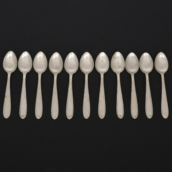 • RADIO ALPACA. Conjunto de colheres para chá confeccionadas em alpaca espessurado à prata, cabo de ponta oval, ricamente relevado com folhas de acanto e borda contornada por fileira perlada. Marca da manufatura puncionada no verso. Composto de dez(10) unidades. Apresentam marcas de uso e do tempo, vide foto. Medida: Comp.: 11,5 cm.