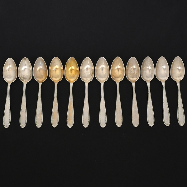 • RADIO ALPACA. Conjunto de colheres médias confeccionadas em alpaca espessurado à prata, cabo de ponta oval, ricamente relevado com folhas de acanto e borda contornada por fileira perlada. Marca da manufatura puncionada no verso. Composto de onze(11) unidades. Apresentam marcas de uso e do tempo, vide foto. Medida: Comp.: 17,5 cm.