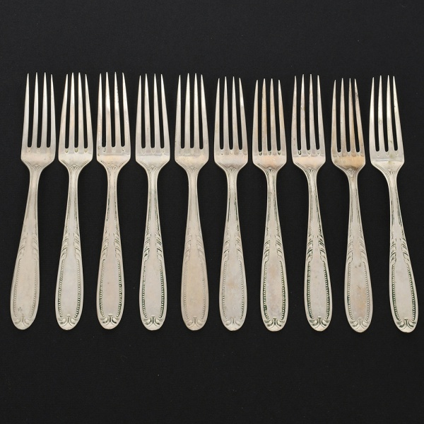 • RADIO ALPACA. Conjunto de garfos para sobremesa confeccionadas em alpaca espessurado à prata, cabo de ponta oval, ricamente relevado com folhas de acanto e borda contornada por fileira perlada. Marca da manufatura puncionada no verso. Composto de dez(10) unidades. Apresentam marcas de uso e do tempo, vide foto. Medida: Comp.: 17 cm.