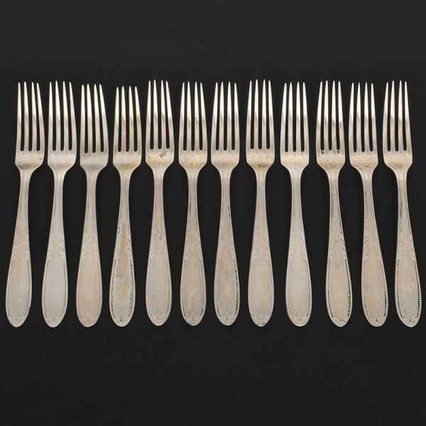 • RADIO ALPACA. Conjunto de garfos grandes confeccionadas em alpaca espessurado à prata, cabo de ponta oval, ricamente relevado com folhas de acanto e borda contornada por fileira perlada. Marca da manufatura puncionada no verso. Composto de doze(12) unidades. Apresentam marcas de uso e do tempo, vide foto. Medida: Comp.: 19,5 cm.