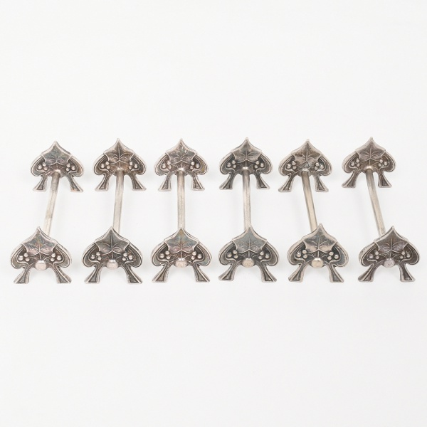 • Elegante conjunto de descansos para talher confeccionado em metal espessurado à prata, haste tubular com suportes laterais em forma de folha, cinzelada e decorada com heras em relevo. Composto de seis(06) unidades. Med.: Alt. 3,5 x Comp. 8 x Larg. 3 cm.