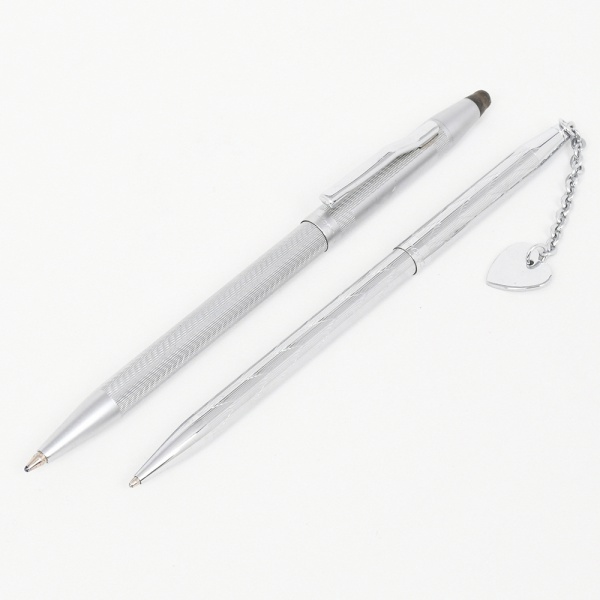 • Duas(02) canetas esferográficas da marca Compactor, fabricação nacional, exemplares de corpo cilíndrico metálico, ambos com acabamento decorativo gravado em padrão guilhochado linear, seção anterior afilada e clipe metálico aplicado. uma apresenta mecanismo retrátil por torção, acionado mediante rotação da seção superior do corpo, a outra possui mecanismo de ejeção por pressão. Uma delas apresenta corrente metálica com pingente em forma de coração, característica associada a canetas de balcão ou uso promocional. Uma está com o sistema de ejeção o bico travado, necessita ajuste. Estado conforme fotografias. Medidas: Comp.: 13,5 cm.
