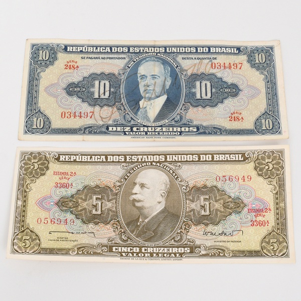 • Cédulas da República dos Estados Unidos do Brasil Cruzeiros Tesouro Nacional. Conjunto composto por duas cédulas emitidas pelo Tesouro Nacional do Brasil durante o período da chamada República dos Estados Unidos do Brasil, impressas pela American Bank Note Company: a) Cédula de 10 Cruzeiros, efígie de Getúlio Vargas, papel-moeda com impressão em calcografia e litografia policroma. Anverso com medalhão central contendo retrato de Getúlio Vargas, ladeado por arabescos ornamentais, numerais de valor e legendas República dos Estados Unidos do Brasil, Dez Cruzeiros, Valor Recebido. Numeração tipográfica em vermelho, série 248A, número 034497. Reverso com composição alegórica representando figura masculina alada empunhando ferramenta, acompanhada de elementos industriais e engrenagens, dentro de moldura ornamental com numerais repetidos do valor facial. b) Cédula de 5 Cruzeiros, efígie de Epitácio Pessoa, cédula impressa pela mesma casa impressora, apresentando no anverso medalhão com retrato de Epitácio Pessoa e ornamentação guilhochê. Valor facial indicado em múltiplos cartuchos e numeração tipográfica em vermelho. Série 3360A, número 056949. Reverso com cena figurativa identificada como Conquista do Amazonas, representando grupo de personagens em acampamento às margens de curso dágua, inserida em moldura decorativa com numerais repetidos do valor. Estado conforme fotografias.
