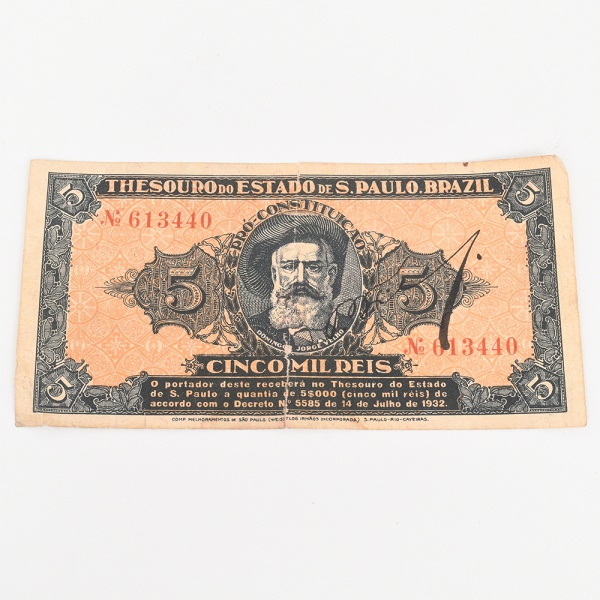 • Bônus do Thesouro do Estado de São Paulo  Revolução Constitucionalista. Título fiduciário emitido pelo Tesouro do Estado de São Paulo durante o contexto da Revolução Constitucionalista de 1932. Cédula no valor de Cinco Mil Réis (5$000), identificada como Bônus do Thesouro do Estado  Pró Constituição, destinada ao financiamento do movimento constitucionalista paulista. Anverso com medalhão central contendo o retrato de Domingos Jorge Velho, bandeirante associado à expansão territorial paulista, ladeado por cartelas ornamentais com o numeral do valor. Na parte superior lê-se Thesouro do Estado de S. Paulo, Brazil, com numeração tipográfica em vermelho Nº 613440. Abaixo do retrato consta a legenda Cinco Mil Réis e inscrição indicando o resgate pelo Tesouro do Estado conforme Decreto nº 5585 de 14 de julho de 1932. Reverso com composição tipográfica central contendo a inscrição Bonus do Thesouro do Estado  Pro Constituição  São Paulo, acompanhada de numerais laterais do valor e fundo ornamental guilhochê. Peça integrante das emissões emergenciais realizadas pelo governo paulista durante o conflito de 1932, utilizadas como instrumento financeiro e meio de arrecadação para sustentar o esforço político-militar do movimento constitucionalista. Estado conforme fotografias, apresenta rasgo no meio.