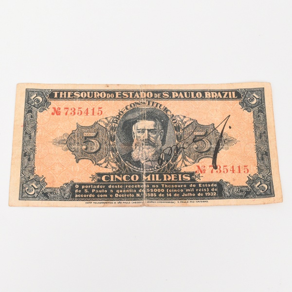 • Bônus do Thesouro do Estado de São Paulo  Revolução Constitucionalista. Título fiduciário emitido pelo Tesouro do Estado de São Paulo durante o contexto da Revolução Constitucionalista de 1932. Cédula no valor de Cinco Mil Réis (5000), identificada como Bônus do Thesouro do Estado  Pró Constituição, destinada ao financiamento do movimento constitucionalista paulista. Anverso com medalhão central contendo o retrato de Domingos Jorge Velho, bandeirante associado à expansão territorial paulista, ladeado por cartelas ornamentais com o numeral do valor. Na parte superior lê-se Thesouro do Estado de S. Paulo, Brazil, com numeração tipográfica em vermelho Nº 735415. Abaixo do retrato consta a legenda Cinco Mil Réis e inscrição indicando o resgate pelo Tesouro do Estado conforme Decreto nº 5585 de 14 de julho de 1932. Reverso com composição tipográfica central contendo a inscrição Bonus do Thesouro do Estado  Pro Constituição  São Paulo, acompanhada de numerais laterais do valor e fundo ornamental guilhochê. Peça integrante das emissões emergenciais realizadas pelo governo paulista durante o conflito de 1932, utilizadas como instrumento financeiro e meio de arrecadação para sustentar o esforço político-militar do movimento constitucionalista. Estado conforme fotografias, apresenta rasgo no meio.
