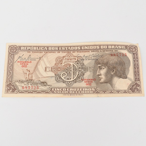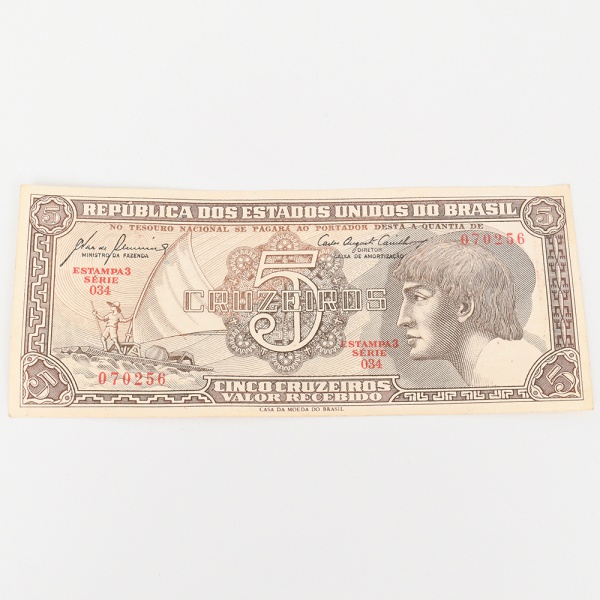• Cédula  Cinco Cruzeiros  República dos Estados Unidos do Brasil. Papel-moeda emitido pelo Tesouro Nacional do Brasil e impresso pela Casa da Moeda do Brasil, pertencente à primeira série do cruzeiro introduzida pela reforma monetária de 1942. Anverso com composição em moldura geométrica e fundo guilhochê, apresentando medalhão inferior com busto feminino alegórico representando a República. No campo superior figura vinheta ilustrando pescador em embarcação lançando rede em ambiente fluvial. Ao centro lê-se a inscrição Cinco Cruzeiros, acompanhada da legenda República dos Estados Unidos do Brasil. Numeração tipográfica em vermelho nº 070256, com indicação Estampa 3  Série 034. Reverso com composição monocromática em tom castanho, exibindo ao centro representação botânica da vitória-régia (Victoria amazonica), inscrita em cartela com a legenda Vitória-Régia. Moldura decorativa geométrica com repetição do numeral 5 e inscrição Estados Unidos do Brasil. Cédula emitida na década de 1940, no período inicial do sistema monetário do cruzeiro (19421967), caracterizada por impressão calcográfica, fundos de segurança guilhochados e iconografia naturalista associada à paisagem brasileira. Estado conforme fotografias.