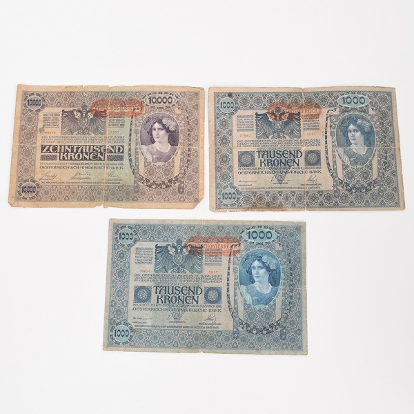 • Três(03) cédulas  Coroas austríacas. Conjunto composto por três cédulas estrangeiras do Império Austro-Húngaro / República da Áustria, pertencentes ao período de transição monetária após a Primeira Guerra Mundial. a) Cédulas de 1000 Kronen (Mil Coroas)  duas unidades. Emitidas pelo OesterreichischUngarische Bank, com inscrições em língua alemã e composição ornamental guilhochê. Anverso com brasão imperial austro-húngaro e valor Tausend Kronen, acompanhado de carimbo vermelho com a inscrição Deutschösterreich, aplicado após a dissolução do Império em 1918 para validar as notas no território da nova República da Áustria. Reverso com composição decorativa apresentando medalhões com busto feminino alegórico, representando a personificação feminina do Estado austríaco, e arabescos ornamentais; b) Cédula de 10.000 Kronen (Dez Mil Coroas)  uma unidade. Emitida pelo Oesterreichische Nationalbank, já no período da República da Áustria. Anverso com legenda Zehntausend Kronen e composição ornamental semelhante às emissões anteriores, acompanhada de carimbo territorial. Reverso com medalhões femininos alegóricos e ornamentação simétrica em estilo guilhochê. As peças pertencem ao sistema monetário baseado na coroa austro-húngara (Krone/Krone), vigente entre o final do século XIX e as primeiras décadas do século XX, período marcado por sucessivas emissões e revalidações decorrentes da fragmentação do Império Austro-Húngaro após 1918. Apresentam rasgos e dobraduras, estado conforme fotografias.