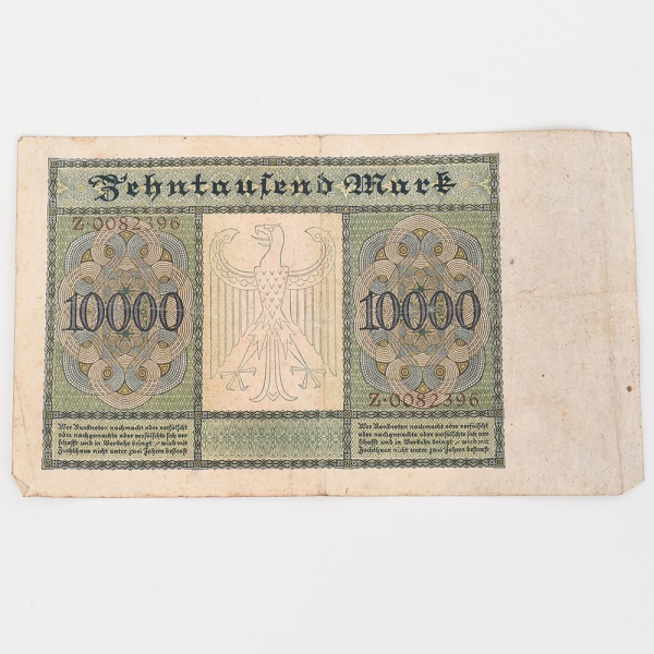 • Alemanha - 10.000 Mark (Zehntausend Mark), República de Weimar. Cédula emitida pela Reichsbank, datada de 19 de janeiro de 1922, pertencente às emissões fiduciárias do período inflacionário da República de Weimar. Impressão em papel fiduciário com composição ornamental guilhochê e tipografia em caracteres góticos. Anverso: campo central com a inscrição Reichsbanknote Zehntausend Mark, acompanhada da fórmula de pagamento ao portador e data de emissão em Berlim. Série alfanumérica impressa em vermelho (Z 0082396). Selos circulares com águia germânica. À direita, painel figurativo contendo busto de Albrecht Dürer, gravador e pintor alemão do Renascimento, em medalhão lateral. Valor facial 10000 inscrito em cartela oval inferior e repetido em cartelas ornamentais. Reverso: composição simétrica em guilhochê com águia imperial estilizada ao centro, ladeada por cartelas ornamentais contendo o valor 10000 e inscrições Zehntausend Mark. Peça pertencente às emissões fiduciárias alemãs produzidas durante o processo inflacionário que antecedeu a hiperinflação de 1923, período caracterizado por sucessivas emissões de altas denominações monetárias. Alemanha, 1922. Estado conforme fotografias.