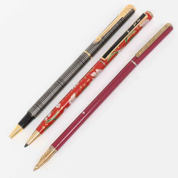 • Três(03) canetas: a) Caneta esferográfica de corpo cilíndrico em metal com acabamento canelado longitudinal, apresentando frisos regulares ao longo de toda a extensão. Ponteira cônica metálica dourada. Anel central dourado separando as partes do corpo. Clipe metálico dourado, fixado à tampa, com terminação chanfrada. Sistema de acionamento retrátil por torção, com avanço e recolhimento do refil por rotação da extremidade superior. Necessita reparo no acionamento. Medida: Comp.: 13 cm. b) Caneta esferográfica de corpo cilíndrico em metal respetivo com esmalte de tom magenta, acabamento liso. tampa removível provida de clipe metálico dourado aplicado. Extremidades e ponteira em metal dourado. Sistema de escrita por esfera (ballpoint), com ponta metálica cônica fixa. Acionamento por remoção de tampa. Medida: Comp.: 12,5 cm; c) Caneta esferográfica de corpo cilíndrico em metal com verniz deu tonalidade vermelha, com decoração aplicada composta por motivos florais estilizados em branco e dourado, com elementos vegetalistas em verde. Tampa removível provida de clipe metálico dourado com cartela retangular esmaltada em preto, inscrita Fat Kee em grafia dourada. Extremidades e ponteira em metal dourado.Sistema de escrita por esfera(ballpoint), com ponta metálica cônica fixa e acionamento por remoção de tampa. Medida: Comp.: 13 cm. Apresentam desgastes e marcas de uso, visíveis nas fotografias.