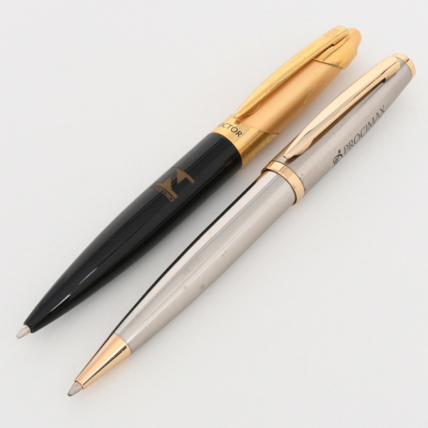 • Dois(02) itens: a) Caneta esferográfica de corpo em resina sintética preta, formato ogival alongado, com extremidade inferior afilada e ponta metálica cônica. Seção superior e tampa em metal dourado, com clipe integrado de perfil aerodinâmico, ostentando logomarca estilizada em relevo na extremidade. Anel de junção também em metal dourado, gravado VICTOR em caracteres impressos. Sistema de acionamento por torção, com mecanismo interno retrátil para projeção da carga esferográfica. Medida: Comp.: 14 cm; b) Caneta esferográfica de corpo metálico em aço escovado, perfil fusiforme alongado, com seção inferior afilada e ponteira cônica em metal dourado polido. Tampa metálica em aço escovado, com extremidades e anéis de acabamento em metal dourado. Clipe metálico dourado, de seção plana e perfil curvo, aplicado à tampa. No corpo, gravação com inscrição PROCIMAX acompanhada de logomarca estilizada. Sistema de acionamento por torção, com mecanismo interno retrátil para projeção da carga esferográfica. Medida: Comp.: 14 cm. Necessitam troca de carga.
