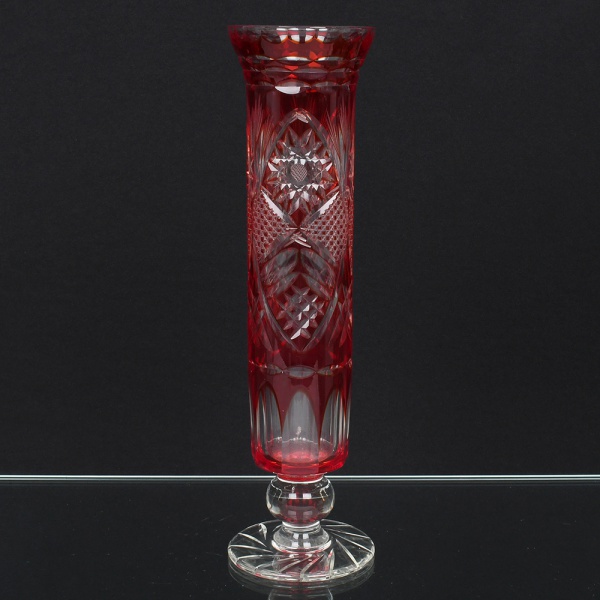 • Vaso em cristal overlay vermelho (ruby flashed crystal), corpo cilíndrico alongado com leve expansão na borda e pé destacado. Cristal incolor revestido externamente por camada de tonalidade vermelha, posteriormente submetido a lapidação profunda, revelando o fundo transparente por meio de cortes geométricos. Decoração composta por reservas em losangos cruzados, estrela central multifacetada, retícula em treliça, folhas estilizadas em corte radial e painéis verticais facetados. Borda superior com friso lapidado em óvulos internos. Pé circular com haste curta em balaústre e base plana decorada por estrela radial lapidada. Medidas: Alt.: 32 x Diam.: 8,5 cm.