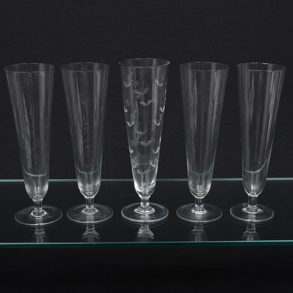 • Conjunto de tulipas em meio cristal, translúcido e incolor, bojo longo de formato obcônico, fuste curto e cilíndrico, base circular. Composto de cinco(05) unidades. Medidas: Alt.: 23 x Diam.: 7 cm.