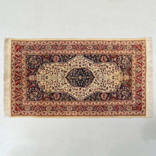 • Tapete Kashimir, fomato retangular de composição axial, apresentando medalhão central circular lobado sobre campo marfim com decoração floral estilizada. Quartos de medalhão nas extremidades do eixo longitudinal. Campo secundário em tonalidade azul-escuro com arabescos e elementos fitomórficos. Bordadura principal vermelha decorada por sequência de motivos florais repetitivos, acompanhada por guardas internas múltiplas. Estado conforme fotografias. Medidas: Alt.: 173 x Comp.: 94 cm.