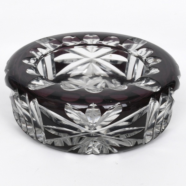 • Cinzeiro circular em cristal lapidado, apresentando corpo espesso com sobreposição cromática em tom ametista, posteriormente lapidada para revelar o cristal incolor inferior, criando contraste decorativo; aba superior apresentando quatro descansos para cigarro moldado com reentrâncias semicirculares, corpo externo ornamentado por lapidação facetada em motivos geométricos e radiais, destacando-se composição em forma de estrela estilizada nas paredes laterais; fundo interno apresenta lapidação estrelada(star-cut), destinada a intensificar a refração da luz. Medidas: Alt.: 5 x Diam.: 15 cm.