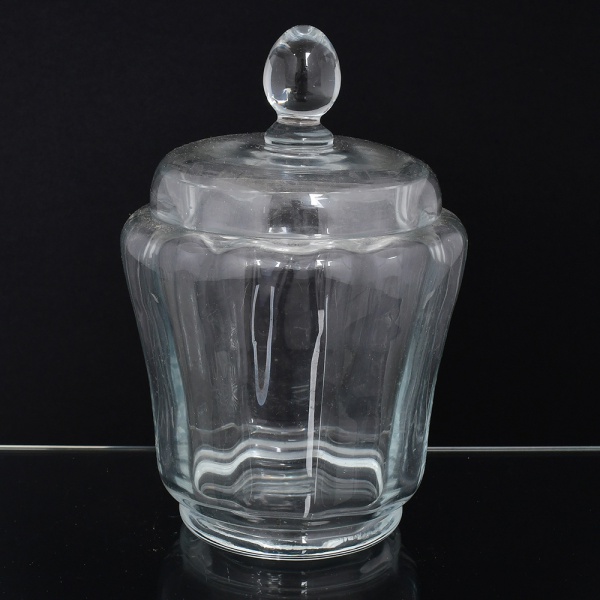 • VIDRO, uma (1) bomboniere com tampa, incolor e translúcida, ligeiramente canelada na vertical, pega da tampa na forma de baga, medindo 20 cm altura, sinais de uso, vide foto.