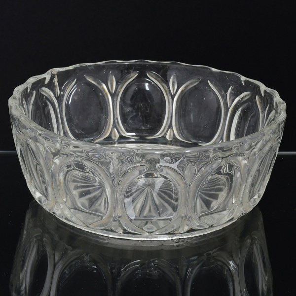 • VIDRO, uma (1) fruteira, incolor e translúcida, moldada em sulcos, fundo em dália, bicadinhos e mossa no fundo, medindo 20 cm diâmetro e 8 cm altura, sinais de uso, vide foto.