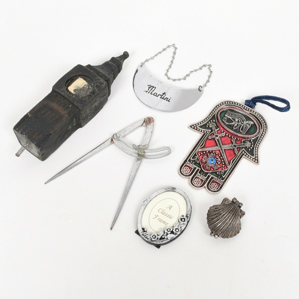 • DIVERSOS, seis (6) objetos variados: 1 identificador para garrafa de bebida, confeccionado em aço, traz a legenda MARTINI; 1 porta-retratos oval, ornamentação relevada em flores, medindo 5,5 x 4 cm, confeccionado em resina e prateado; 1 antigo compasso, confeccionado em metal niquelado, medindo 11,5 cm; 1 caixa no formato de concha bivalve, encimada por cruz, medindo 3,5 cm, confeccionada em metal; 1 simbolo do Judaísmo e Islamismo confeccionado em metal esmaltado, representando Hamsá (Mão de Fátima); 1 parte de demolição em bronze no estado, medindo 13,5 cm, todos os itens com sinais de uso, vide foto.