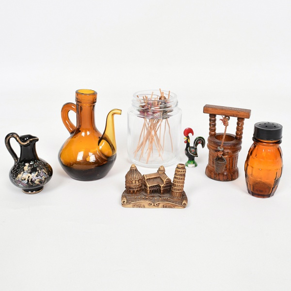 • DIVERSOS, sete (7) itens: 1 galheta sem a tampa, confeccionada em vidro na tonalidade âmbar, translúcida, medindo 10 cm altura; 1 polvilhador confeccionado em vidro âmbar e translúcido, formato de barrica, tampa em polímero, medindo 8 cm; 1 vaso miniatura, confeccionado em faiança ou louça, souvenir da Grécia, ornado com figuras policromadas sobre fundo preto, arremates a ouro; 1 vidro, incolor e translúcido com diversos espetos para petiscos, confeccionados em madeira, extremidades ornadas com esferas coloridas; 1 miniatura representando fonte, souvenir de Orense, confeccionada em madeira, medindo 8,5 cm; 1 escultura metálica representando galo, esmaltada em policromia, souvenir de Barcelos, medindo 5 cm altura; 1 escultura representando pontos turísticos italianos, confeccionada em resina, medindo 7 x 3,5 x 5 cm, vide foto.