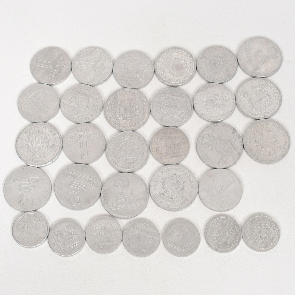 • NUMISMÁTICA, aproximadamente trinta (+/-30) moedas em alumínio, padrão cruzeiro, todas soberbas, datas e valores variados, vide foto.