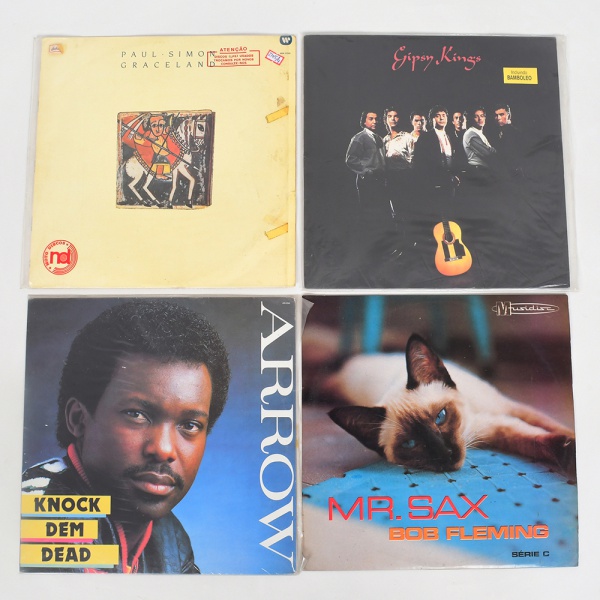 • MÚSICA, quatro (4) LPs em vinil: Bob Fleming; Arrow; Gipsy Kings; Paul Simon, todos aparentemente em bom estado, usados e sem garantia, vide foto.