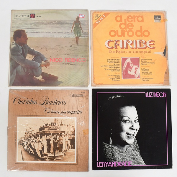 • MÚSICA, quatro (4) LPs em vinil: Leny Andrade; Chorinhos Brasileiros; Caribe  Don Pepito; Nico Fidenco, todos aparentemente em bom estado, usados e sem garantia, vide foto.