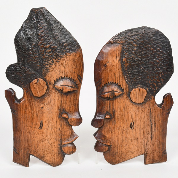 • ARTE TRIBAL AFRICANA, duas (2) esculturas figurativas representando rostos, masculino e feminino, para pendurar em parede, origem Guiné-Bissau, medindo a maior 26 cm altura, vide foto.