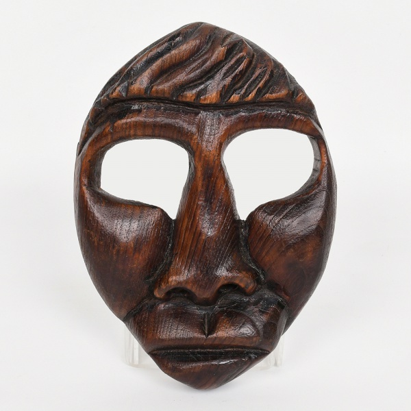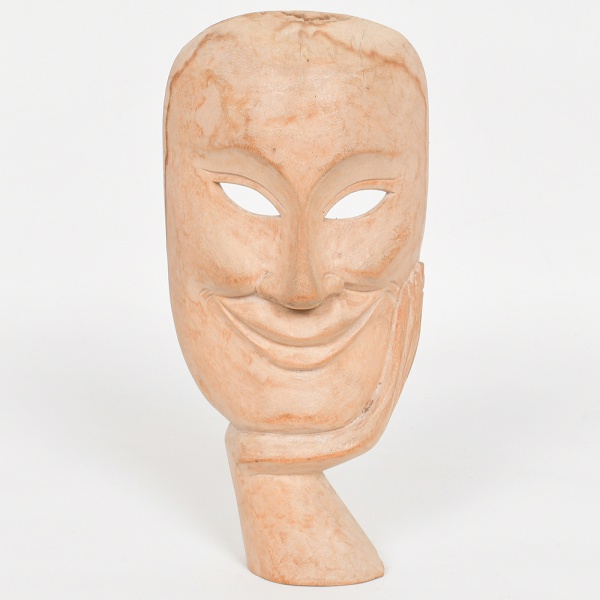 • ESCULTURA, uma (1) representando máscara, entalhada em madeira, origem ignorada, faltando parte junto a base, medindo 23,5 cm altura, vide foto.