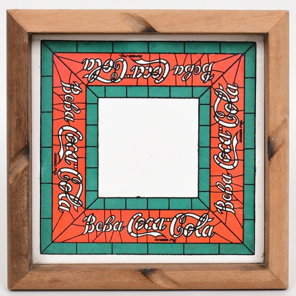 • AZULEJO, um (1) cinzeiro com propaganda da Coca-Cola, moldura em madeira, medindo 18,5 x 18,5 cm, vide foto.
