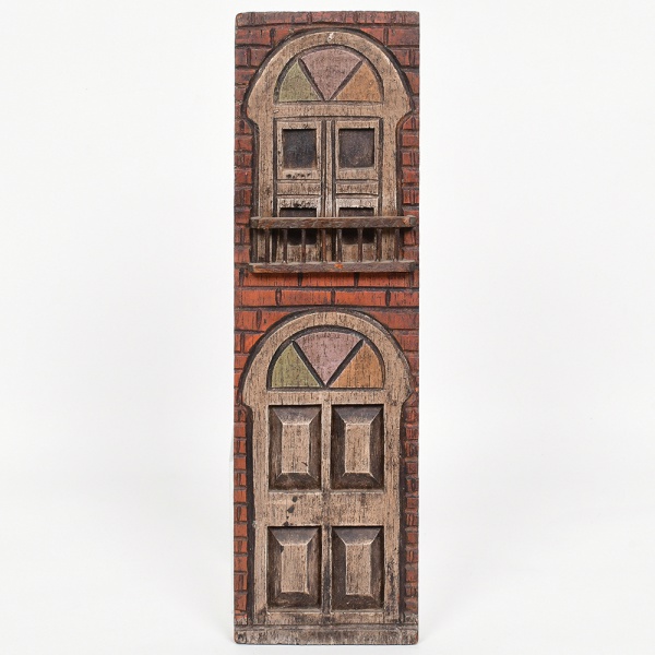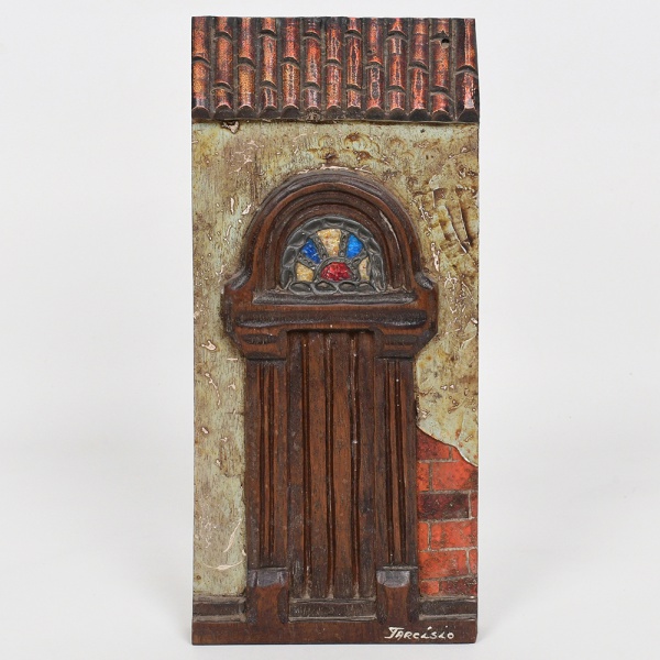 • ARTE POPULAR, uma (1) talha em madeira maciça, policromada, representando porta de casa, possui apliques variados, assinada TARCÍSIO no CID, localizado RIO e datado 77, para fixação em parede, medindo 13 x 30 cm, vide foto.