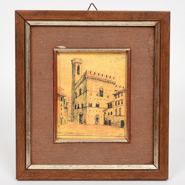 • ARTE ITALIANA, uma (1) pintura sobre folha de ouro, representando paisagem com casario, marca Miniati & Capigatti, Florença, assinada no CID com as iniciais G. L., medindo com moldura 15,5 x 17 cm, vide foto.