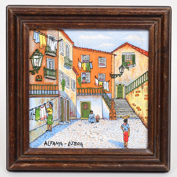 • AZULEJO, um (1) pintado a mão em policromia representando figuras e casario, ALFAMA  LISBOA, moldura em madeira, medindo 14,5 x 14,5 cm, vide foto.